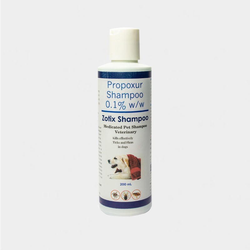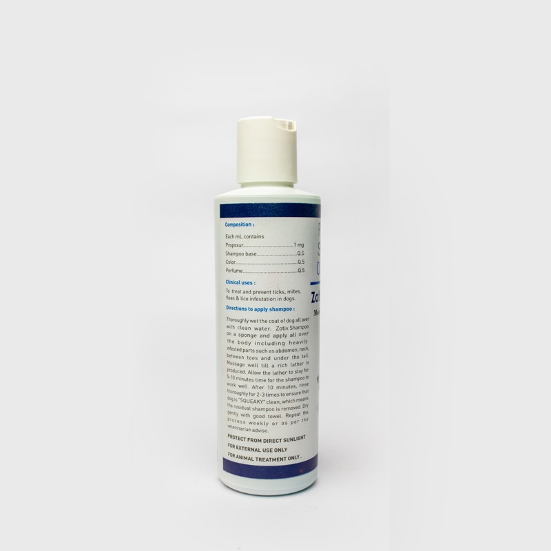 Directions for use : Wash the body of the pet with luke warm water. Use Zotix Shampoo liberally on the hair coat of the pet to produce lather. Avoid sensitive parts of the body such as eyes, ears and mouth of pet. Let the lather be on the body for 3-4 minutes .Wash off pets with plenty of water.